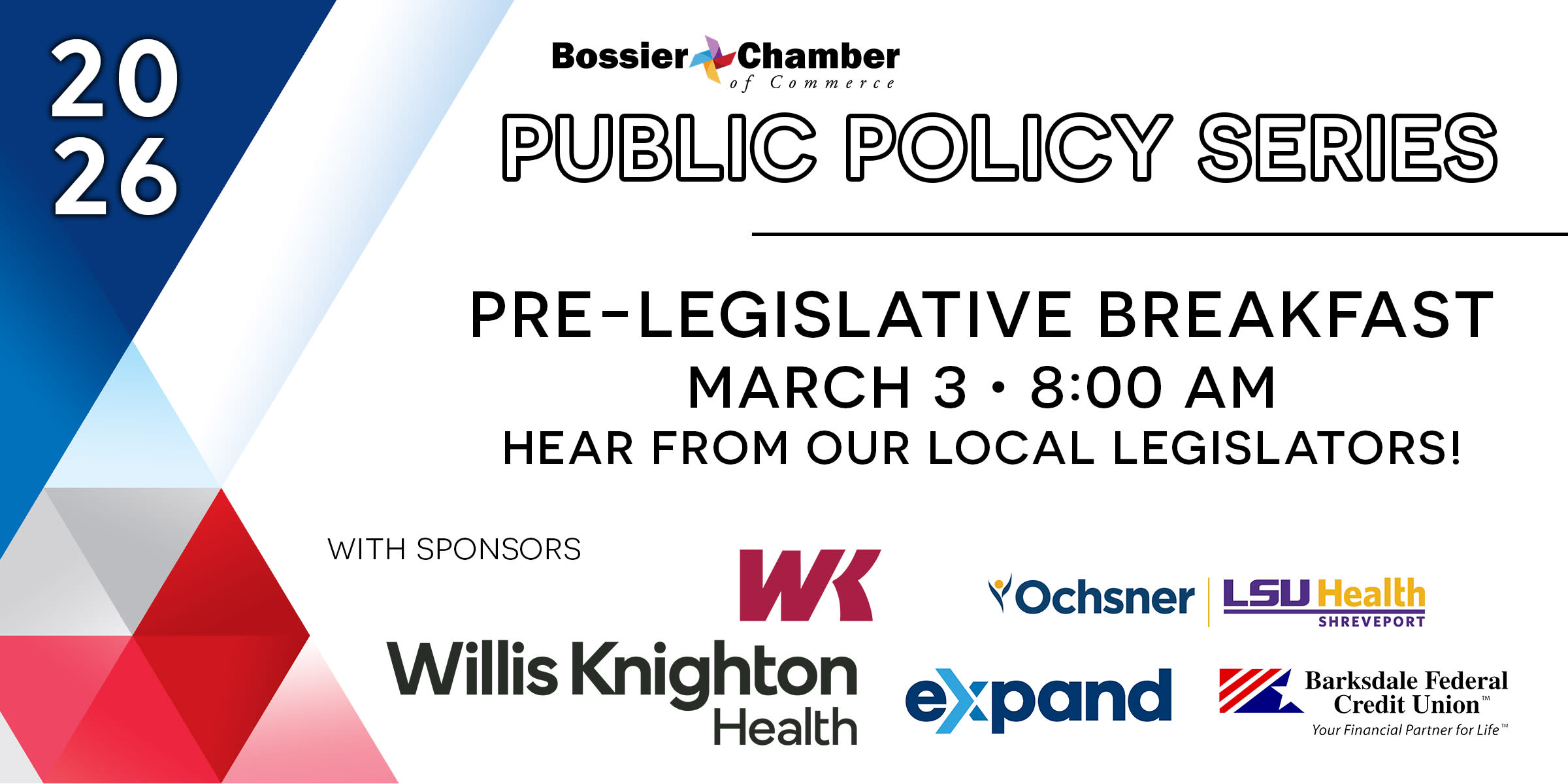 The Bossier Chamber is continuing our 2026 Public Policy Series on March 3 as we host members of our local delegation for a Pre-Legislative Breakfast! Hear their priorities and plans & how it could impact the Bossier-Shreveport business community.