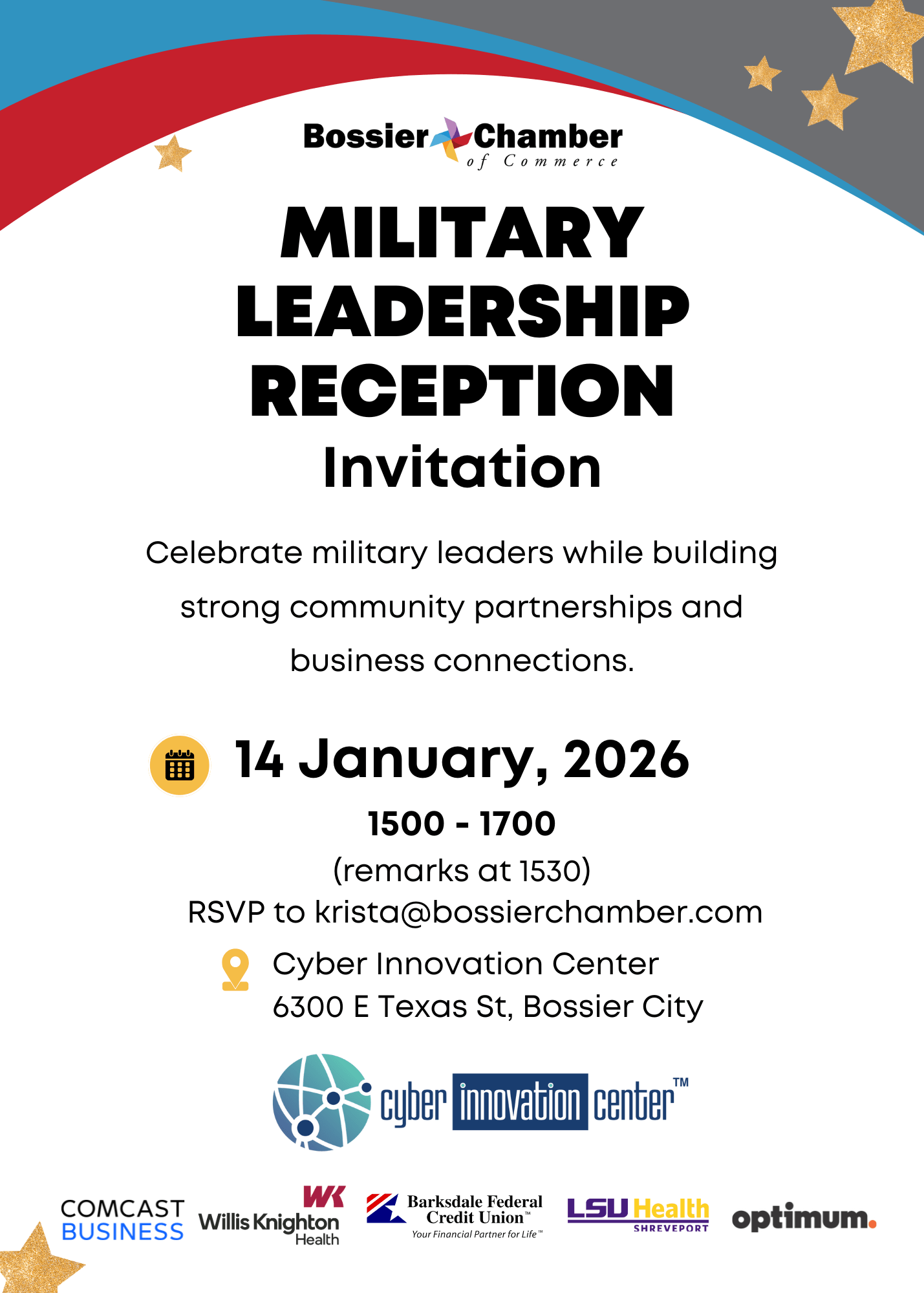 Launched in 2014 by the Bossier Chamber of Commerce, the Military Leadership Reception is an semi-annual event honoring local military leadership and strengthening relationships between Barksdale Air Force Base, area reserve and guard units, and community leaders.